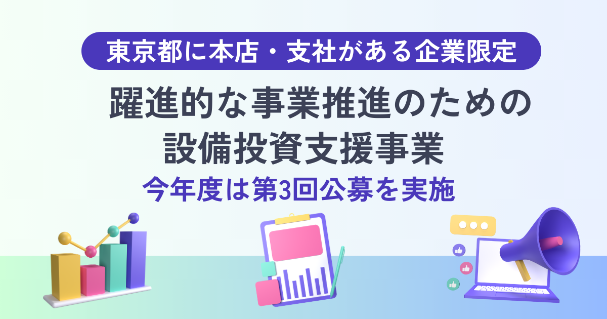 公益財団法人東京都中小企業振興公社が実施する「躍進的な事業推進のための設備投資支援事業」について、今年度は例年の春・秋の2回募集に加え、第3回目の公募が開始されます。
